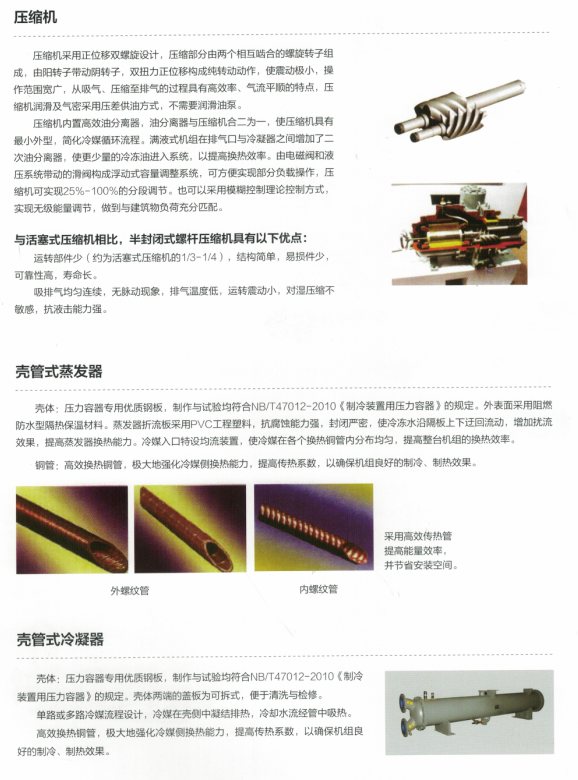 螺桿式冷水機組即風冷螺桿式冷(熱)水機組廣泛應用于賓館、商場、辦公樓、展覽館、機場、體育館等公共設施的舒適性中央空調系統,并能滿足電子、制藥、生物、輕紡、化工、冶金、制藥、電力、機械等行業的工藝性空調系統的不同使用要求。 產品種類及規格: ① 風冷螺桿冷(熱)水機組標準型系列產品冷媒可采用R22、R407C、R134A,共計80多個不同的品種規格。 ② 單機制冷量范圍為96-814kW。 ③ 機組制冷運行時能提供溫度為5-15℃的冷凍水,標準工況:出水溫度7度,回水溫度12度。 ④ 任選件:可根據用戶的特殊要求,提供輔助的功能性器件 產品的質量水平: 1、 本公司生產的風冷螺桿冷(熱)水機組的設計、生產、銷售嚴格按照ISO9001質量保證體系運行,確保產品質量。 2、 具有國際先進水平的<<風冷熱泵空調試驗室>>,用于風冷冷水機組、屋頂式空調機、除濕機、低溫空調機、高溫空調機等機組的設計、開發與試驗研究及產品的出廠測試。嚴把出廠產品質量關,讓用戶買得放心,用得稱心。 3、 風冷螺桿冷(熱)水機組系列產品經國家空調質量檢測中心測定,各項技術性能指標均高于國家標準,產品質量穩定,運行可靠,得到了國內外廣大用戶的好評,市場占有率連年增長,一直處于國內領先地位。 四、主要技術特點: 1、精選名牌配件,機組高效、節能、耐用: ① 機組的壓縮機、冷凝風機、熱力膨脹閥、熱氣旁通閥、換熱管、控制電腦等關鍵元器件均選用知名品牌廠家的產品,確保機組高效、節能、耐用。 ② 機組保溫材料為阻燃材料,避免人為因素而造成的火災事故,確保機組安全運行。 2、完備的機組控制功能,多重安全保護措施、確保機組安全運行: ①機組具備的控制功能: ? 機組啟停控制 ? 遠程、近程控制選擇 ? 機組程序設定 ? 回水溫度控制設定 ? 能量調節自動控制 ? 高水溫低水溫限定報警 ? 防冰凍保護設定 ? 壓縮機啟停程序管理 ? 壓縮機手動管理 ? 機組定時管理 ? 水泵管理 ? 可編程溫度管理 ? 全功能運行參數顯示 ? 故障報警及診斷功能 ②機組具備的安全保護功能: ? 壓縮機相序保護 ? 壓縮機過載、過熱保護 ? 冷凝風機、電機設置過熱保護 ? 系統設有高、低壓力保護裝置 ? 系統設有必備的安全閥、放氣閥、排污閥 ? 熱泵機組配備了能量調節閥,確保機組低溫運行安全、可靠 ? 電器元件具有防觸電保護 ? 防凍保護 ? 系統設有斷水保護 3、機組控制系統智能化,可提供集中監控和遠程監控接口: ①機組采用微電腦控制觸摸控制屏,中文顯示,界面友好。 ②自動化程度高,功能齊全,能實現機組啟停程序管理、定時控制、水泵管理、全功能故障報警及故障自我診斷功能等。同時可選配RS485/RS232通訊接口,方便用戶實現的機組的集中監控和遠程監控。 ③采用三級密碼保護,防止程序和設定參數被隨意更改。 ① 當機組發生故障時,立即自動停止運行,報警輸出故障信號并顯示故障原因及故障所處的地方,以便于故障排除和機組的及時維護。 ② 電機的啟停由電腦控制,并與壓縮機、冷凝風機進行聯鎖控制;壓縮機受電腦控制,供液閥和壓縮機同步動作。 4、制冷系統多回路設計,提高機組的可靠性和抗干擾能力 該系列機組如采用二臺或二臺以上的壓縮機時,均按每一臺壓縮機為一個制冷回路進行設計。每臺壓縮機之間互為備份,從而提高了機組的可靠性和抗干擾能力。 5、依托先進的性能測試裝備,確保機組性能穩定,運行安全、可靠: 擁有先進的試驗室,每一臺空調機均在廠內進行嚴格運轉試驗,確保機組在惡劣的工況下安全、可靠地運行,出廠的產品都是合格品。 螺桿式冷水機組結構特點: 1、匹配名牌優質、高效壓縮機,確保機組高能效比: ? 機組采用半封閉雙螺桿螺桿式壓縮機,與活塞式壓縮機比較,半封閉螺桿壓縮機具有如下優勢: ① 運轉部件少(約為活塞式壓縮機的1/3),結構簡單、易損件少、可靠性高,壽命長; ② 壓縮機吸排氣均勻連續,振動小,對濕壓縮不敏感,抗液擊能力強; ③ 能量調節方面,螺桿壓縮機更具優勢,通過滑閥按需可在25~100%之間自動進行能量調節;有段調節,無級調節均可實現。 2、 匹配高效能翅片式風冷冷凝器: ① 為了適合空氣含塵量大、粉塵偏多的中國國情,風冷冷凝器采用獨特的翅片形狀及結構,強化平片式鋁翅片由進口專用加工設備整體沖壓制作而成,在使傳熱效果顯著提高的同時,表面不易積灰,也便于清洗,防止病菌在翅片上滋生,確保換熱器良好的換熱能力。 ② 換熱器鋁翅片表面經過特殊處理,提高了翅片的耐腐蝕性能,使換熱器的耐用度大大提高。 ③ 風冷式冷凝器采用銅管套鋁翅片結構,其鋁翅片、換熱管均采用進口材料,抗污垢、耐腐蝕。紫銅管、波紋型鋁翅片經機械脹管而成,使其結合緊密,換熱效率高,傳熱系數大;換熱器管板支承板均采用優質不銹鋼板.抗腐蝕能力強、耐用度高。 ④ 冷凝器加工過程中采用先進的清洗技術,提高了熱換器的表面清潔度,從而確保了換熱器的高效換熱能力。 ⑤ 采用獨特的換熱器制冷流程,合理的匹配風量與迎面風速,確保制冷流程與風側冷量的平衡關系,充分發揮了壓縮機的制冷能力和換熱器的換熱能力,使機組高效節能。 ⑥ 冷凝器采用獨特“倒M”型布置,結構緊湊,占地面積小、過風均勻,克服冷凝器氣流短路現象,充分發揮冷凝器換熱能力。 3、 匹配高效能換熱管的干式殼管蒸發器: ① 