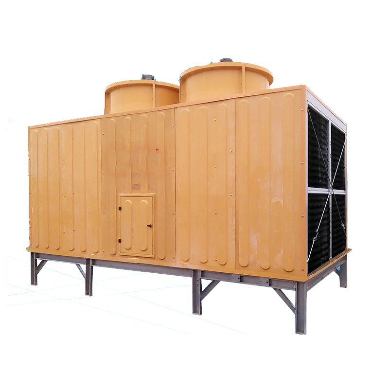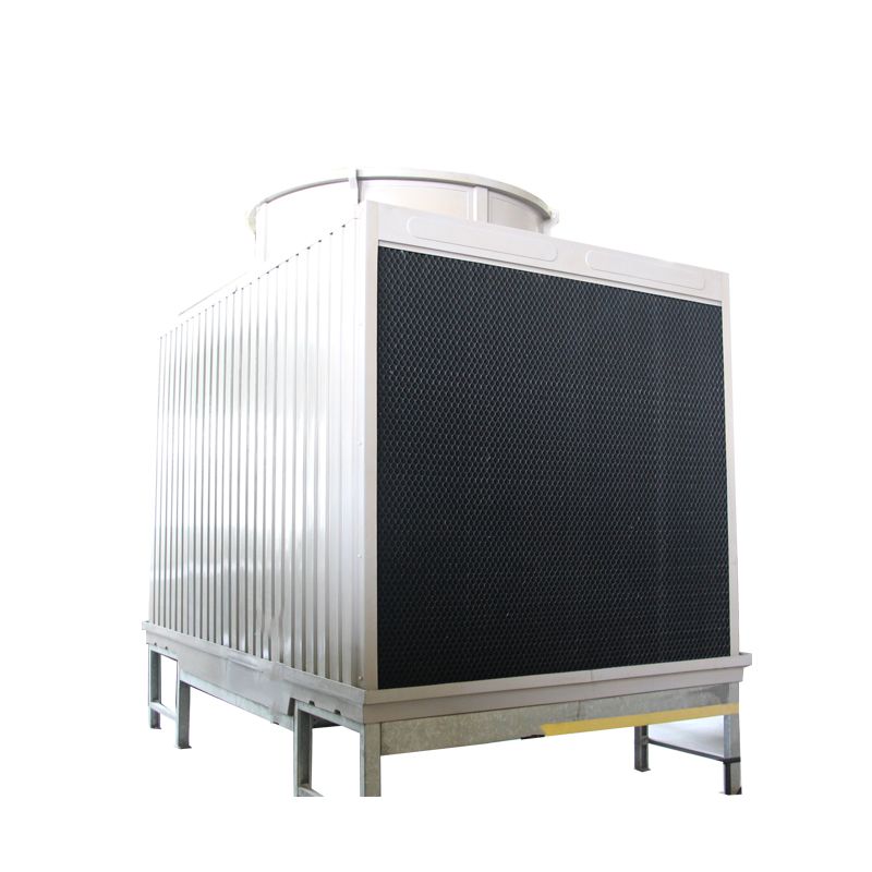 方形橫流式玻璃鋼冷卻塔采用兩側(cè)進風(fēng),靠頂部的風(fēng)機,使空氣經(jīng)由塔兩側(cè)的填料,與熱水進行介質(zhì)交換,濕熱空氣再排向塔外。填料采用兩面有凸點的點波片,通過安裝頭使點波片粘結(jié)成整體,以提高剛性,兩面的凸點還可避免直接滴水,因此提高了水膜形成能力,填料尾部設(shè)有收水措施。