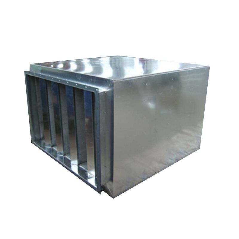 ZKS折板式消聲器是經改良的一種片式阻性消聲器,吸音片呈折板狀,增加了聲波的反射次數,使得消聲性能提高,該消聲器采用玻璃棉作吸音材料,鍍鋅穿孔板和超細玻璃棉布為護板,管道有效通道比較大,壓力損失小,是一種性能優良的消聲器。